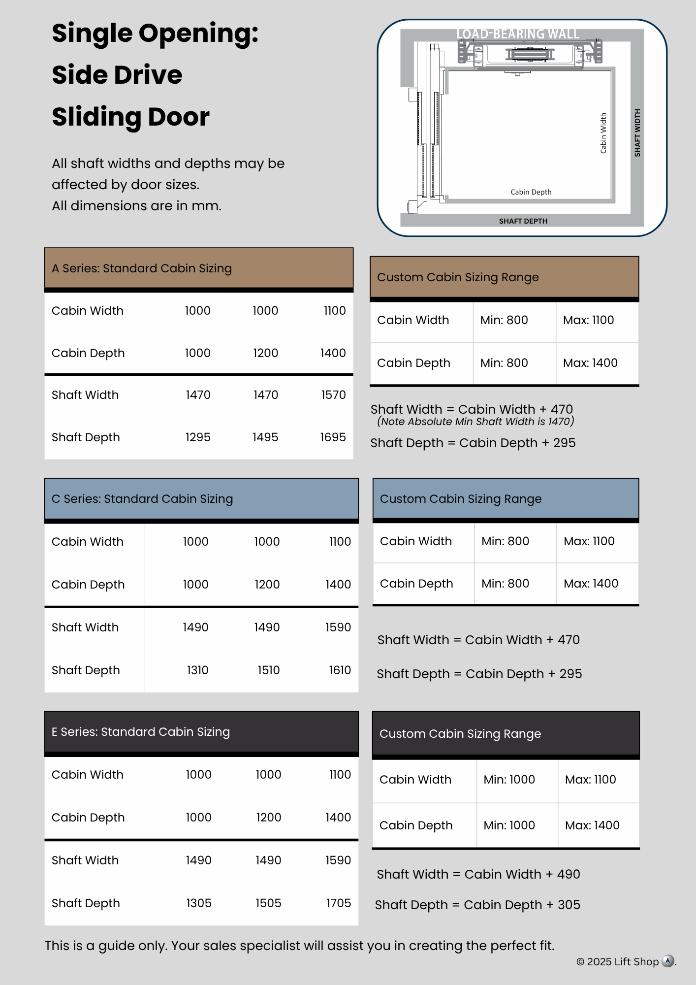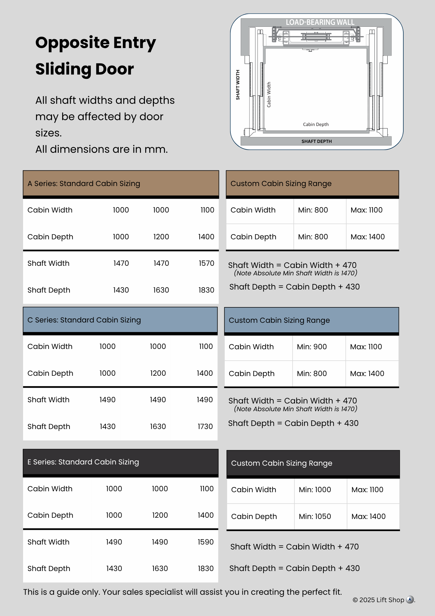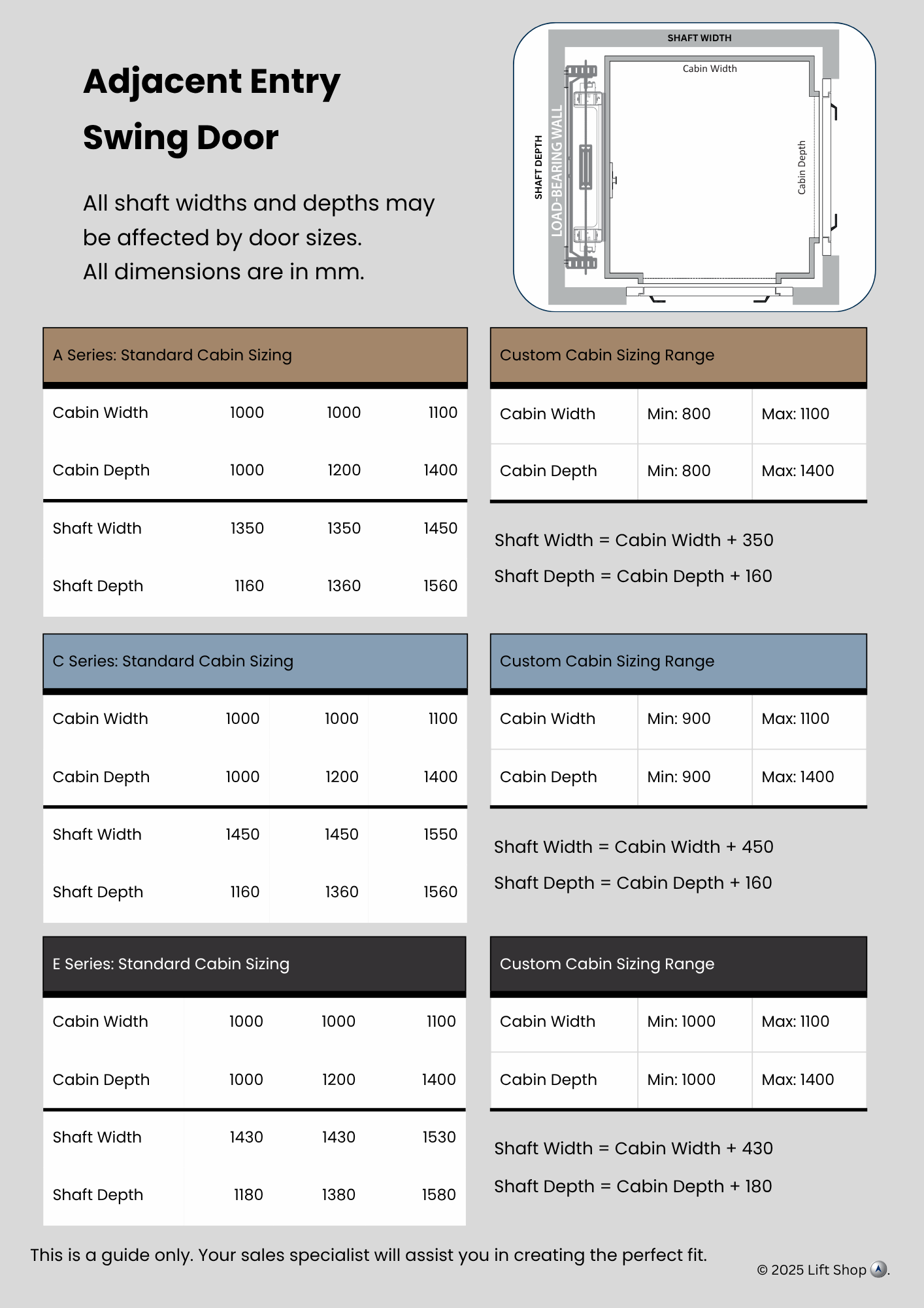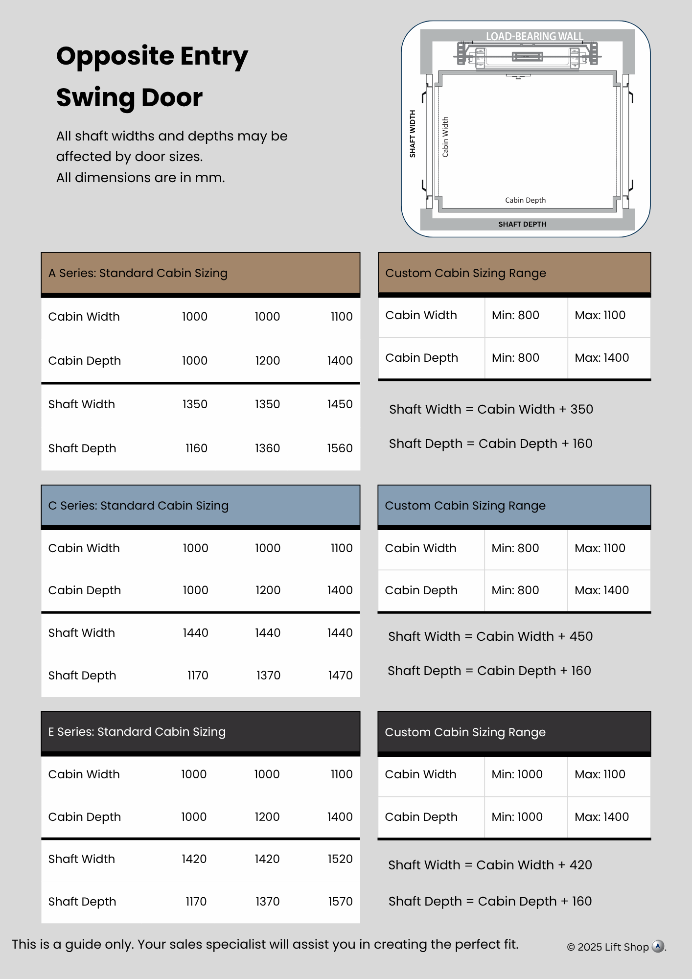 Indicative data for early design. Confirm final numbers with our technical team before construction.All dimensions indicative only. Site conditions, door choices and travel height can alter requirements.