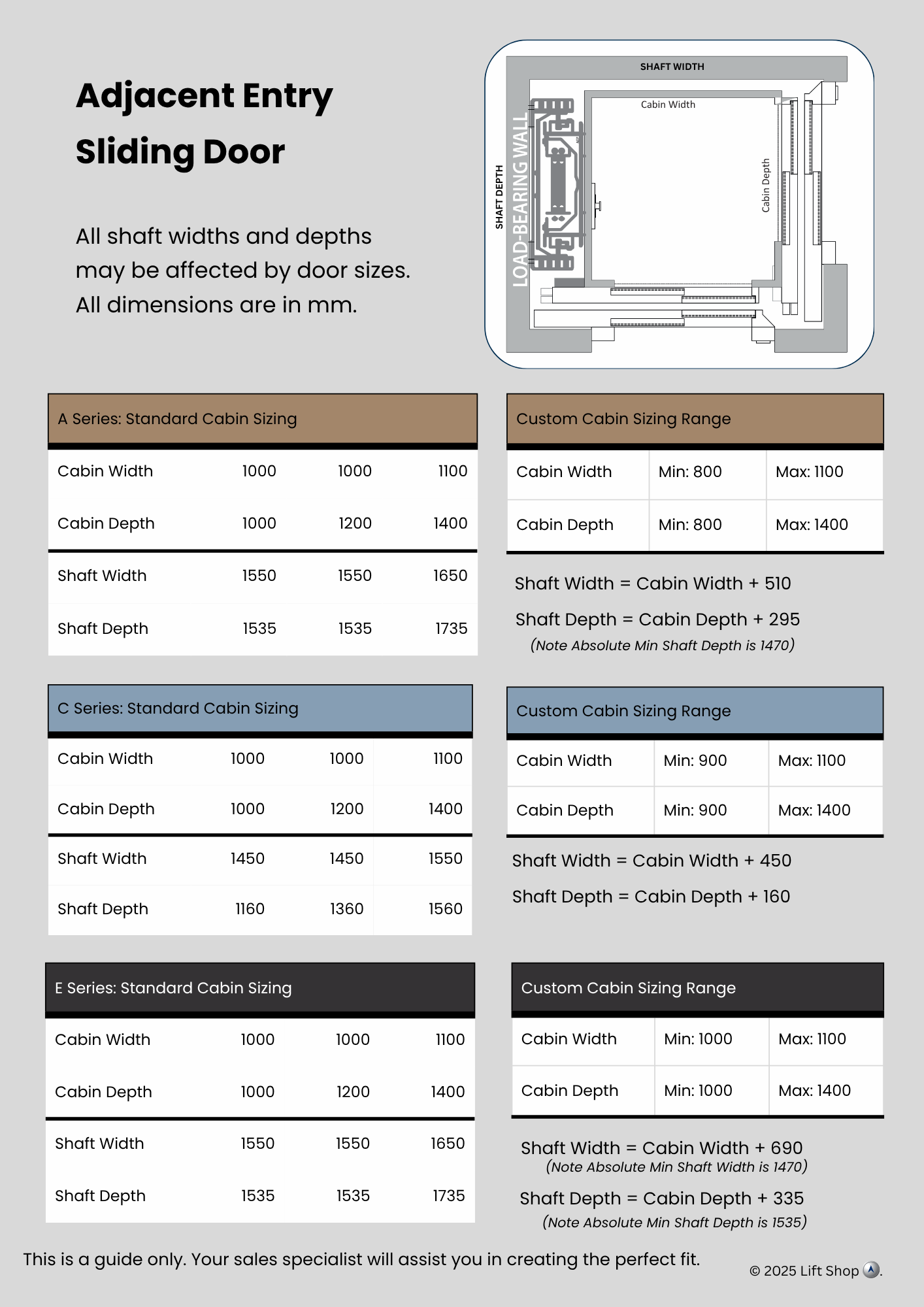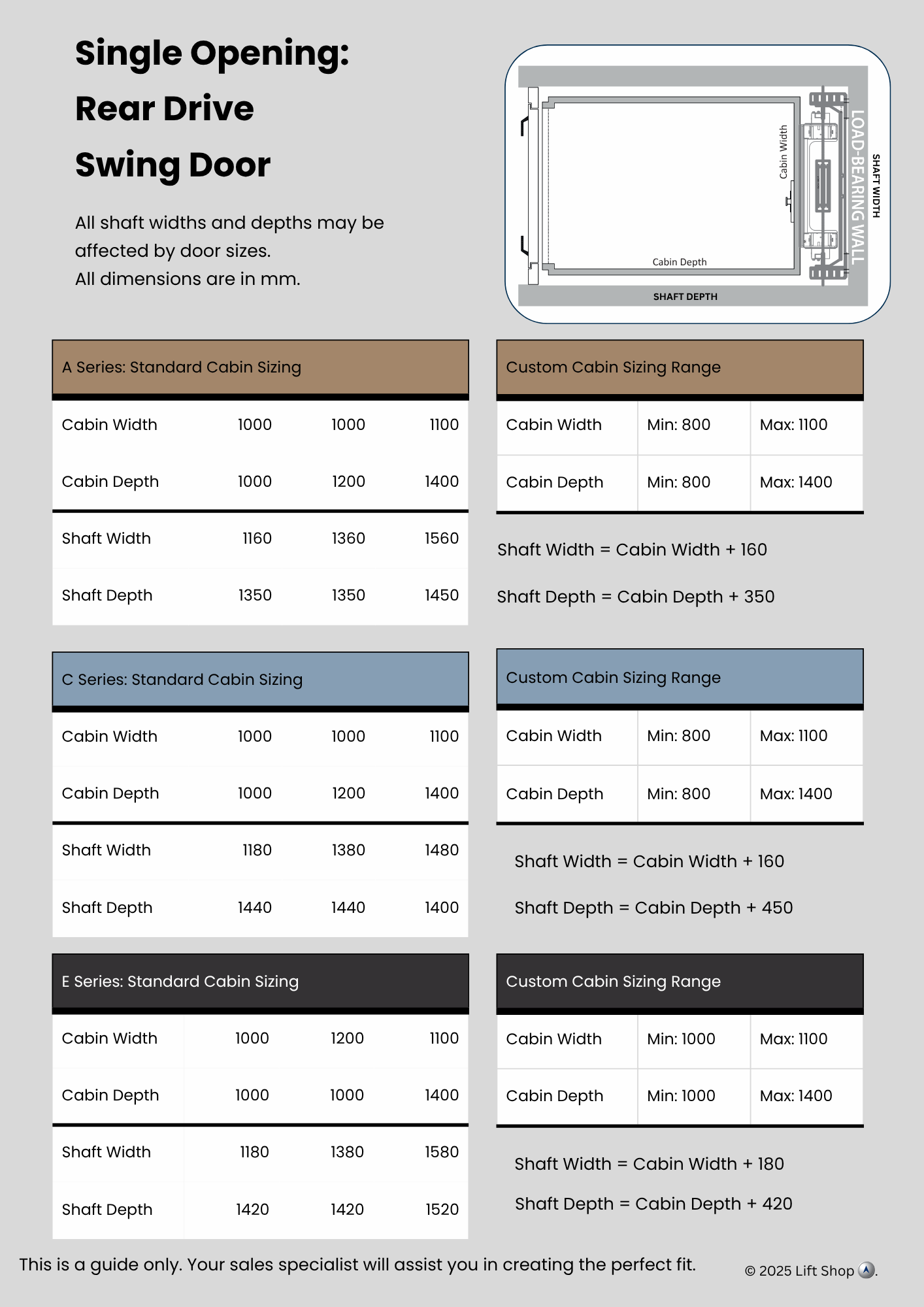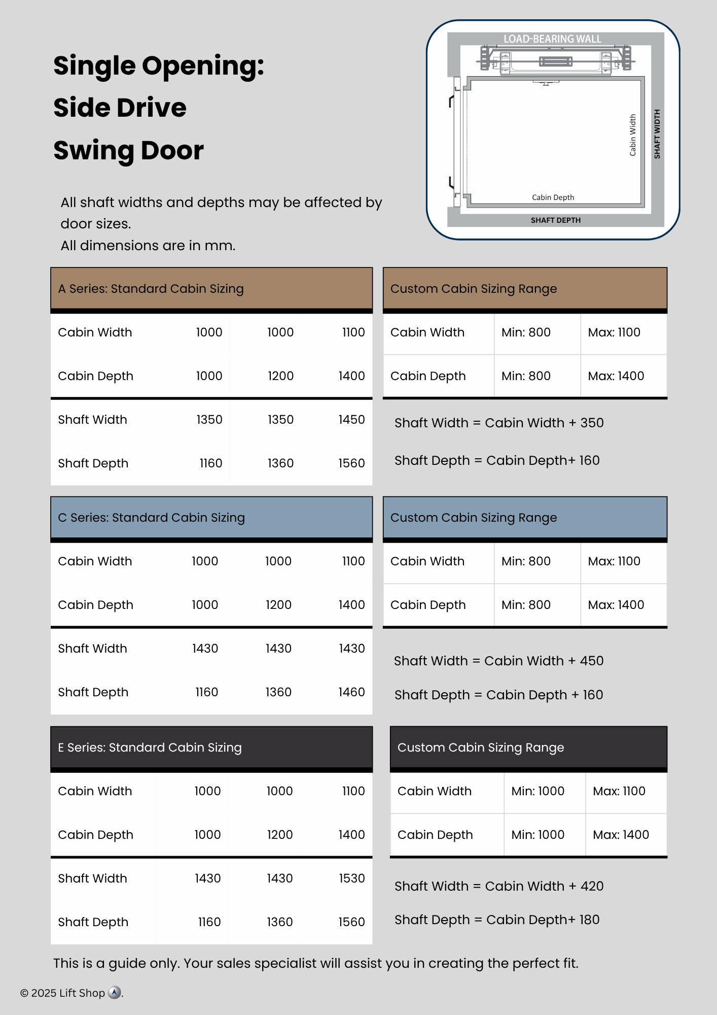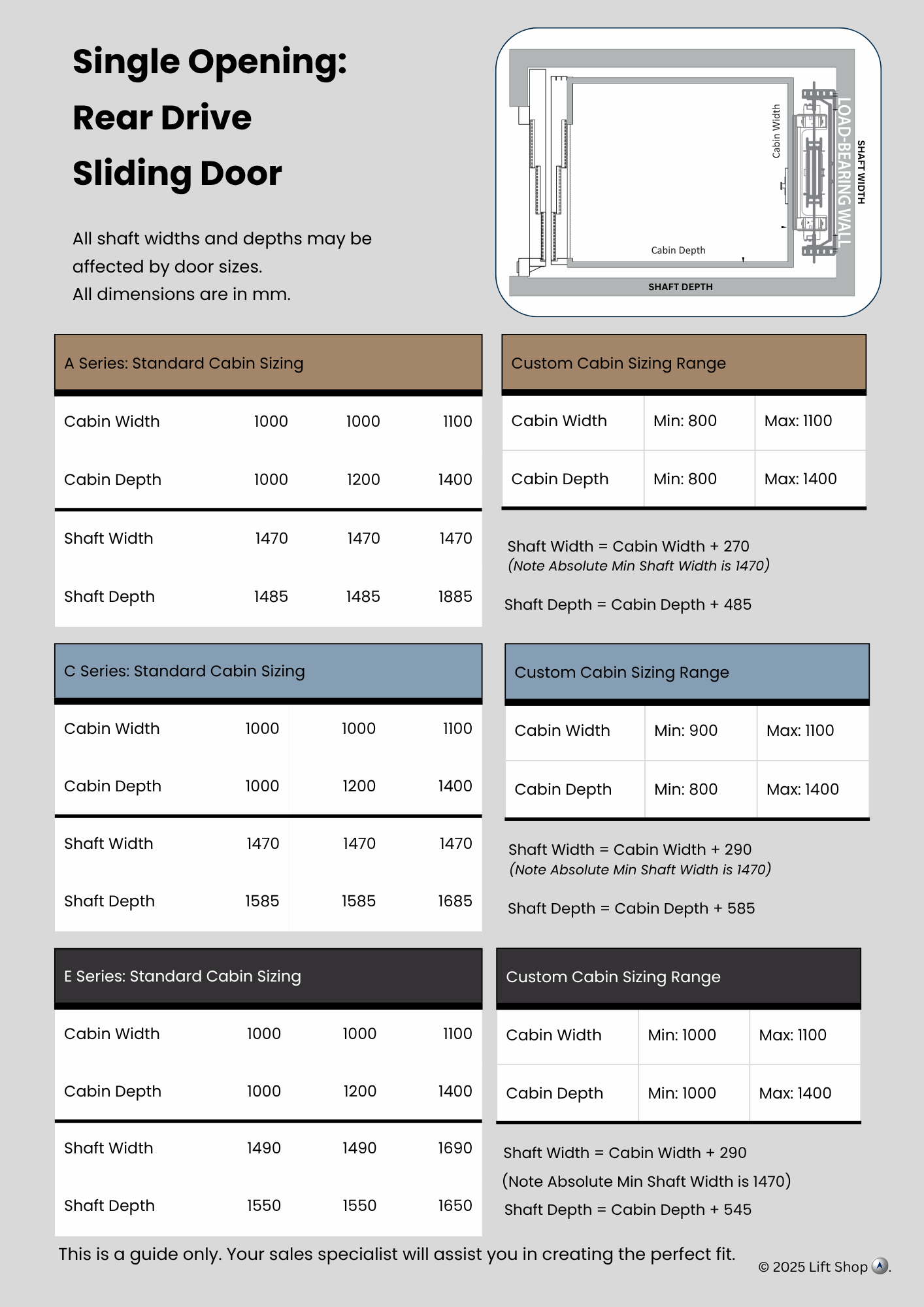 Indicative data for early design. Confirm final numbers with our technical team before construction.All dimensions indicative only. Site conditions, door choices and travel height can alter requirements.