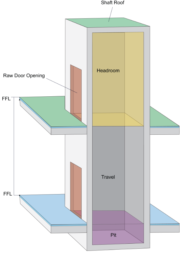 Headroom is located at the top of the lift shaft and is required for installation. If additional headroom is available, extra travel tolerance can be achieved.