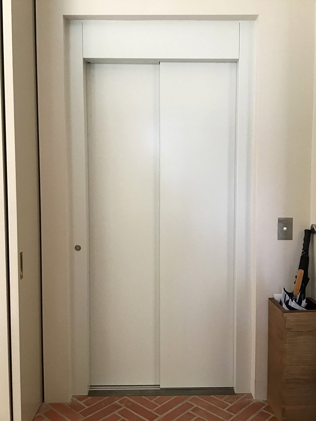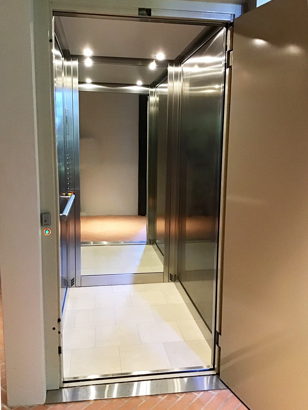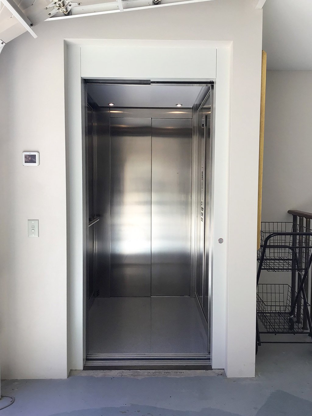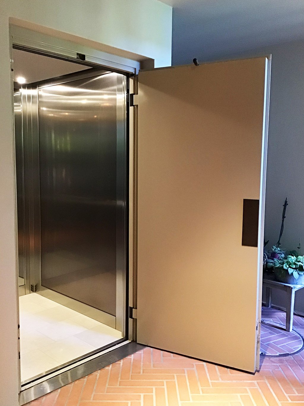 The choice of a solid steel swing door for the first lift was guided by the client’s desire to customize the door finish to blend with the home’s garage and entrance styles. Meanwhile, the sliding doors on the second lift provide efficient, space-saving access ideal for a tight hallway between the lobby and laundry.