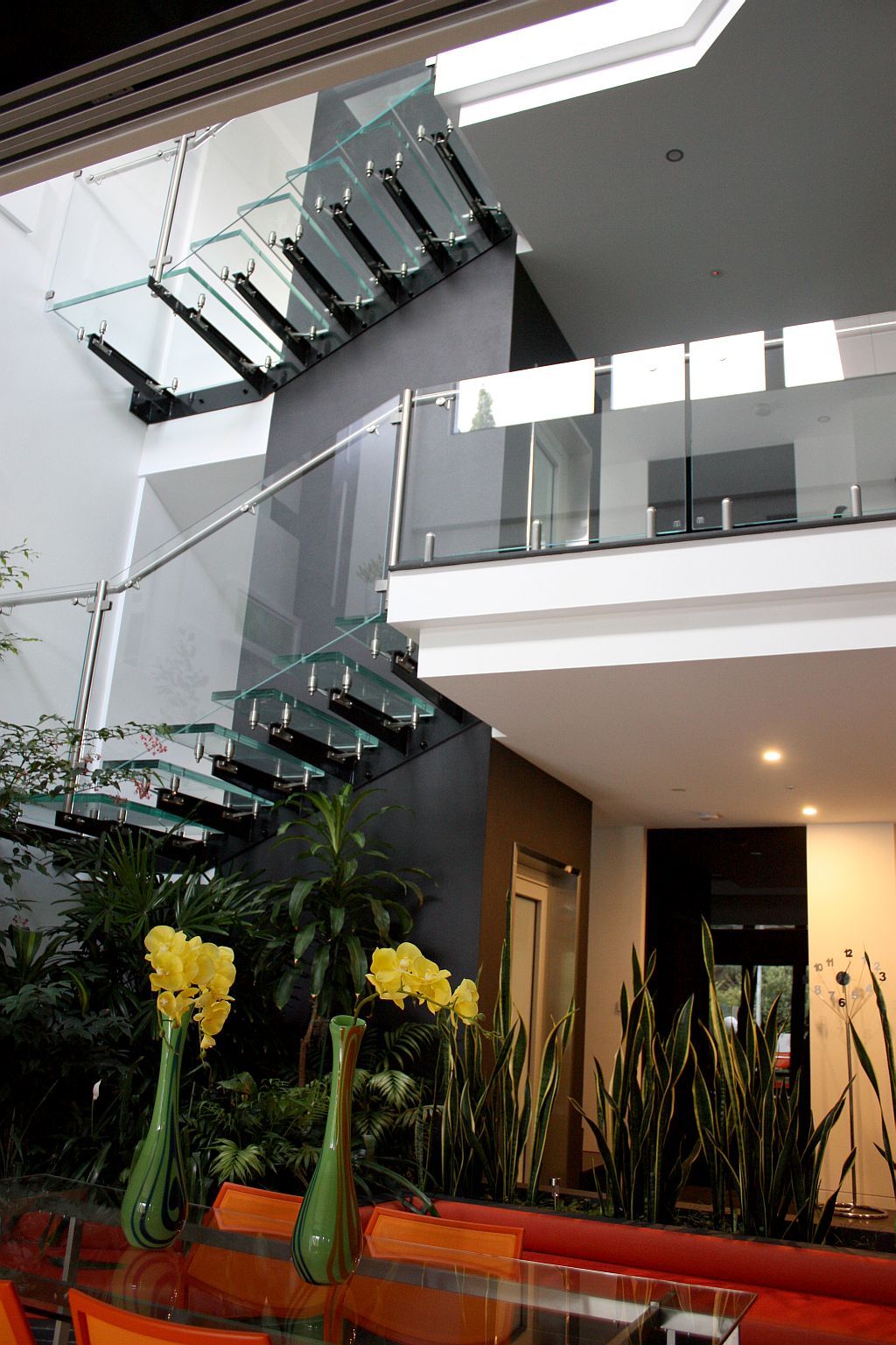 The lift shaft itself was painted in a distinctive feature colour, making it a deliberate architectural statement rather than an afterthought. Surrounded by a wrap-around glass staircase, the lift shaft forms the dynamic core of the home’s vertical circulation, marrying transparency with strength and movement.