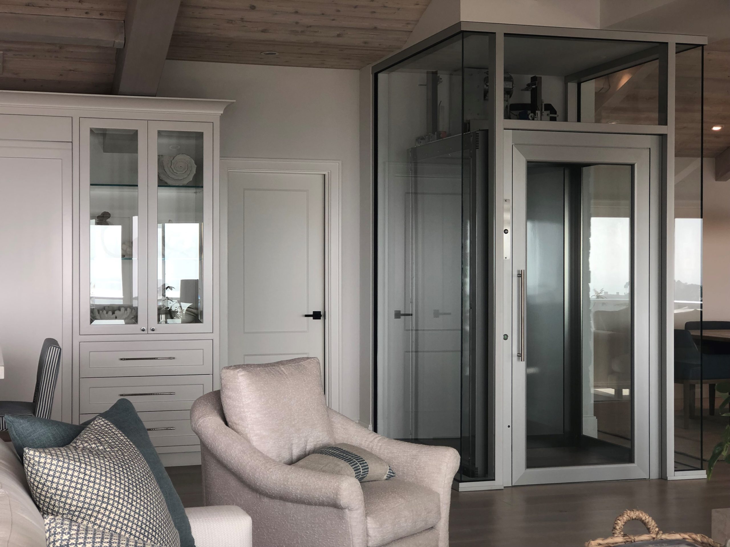 By installing this custom E1 Swing Door lift, the homeowners gained effortless access between floors while enhancing the aesthetic and experiential qualities of their home. The lift’s transparency and sleek design preserve the open-plan feel and coastal charm, proving that a residential lift can be both practical and visually stunning.