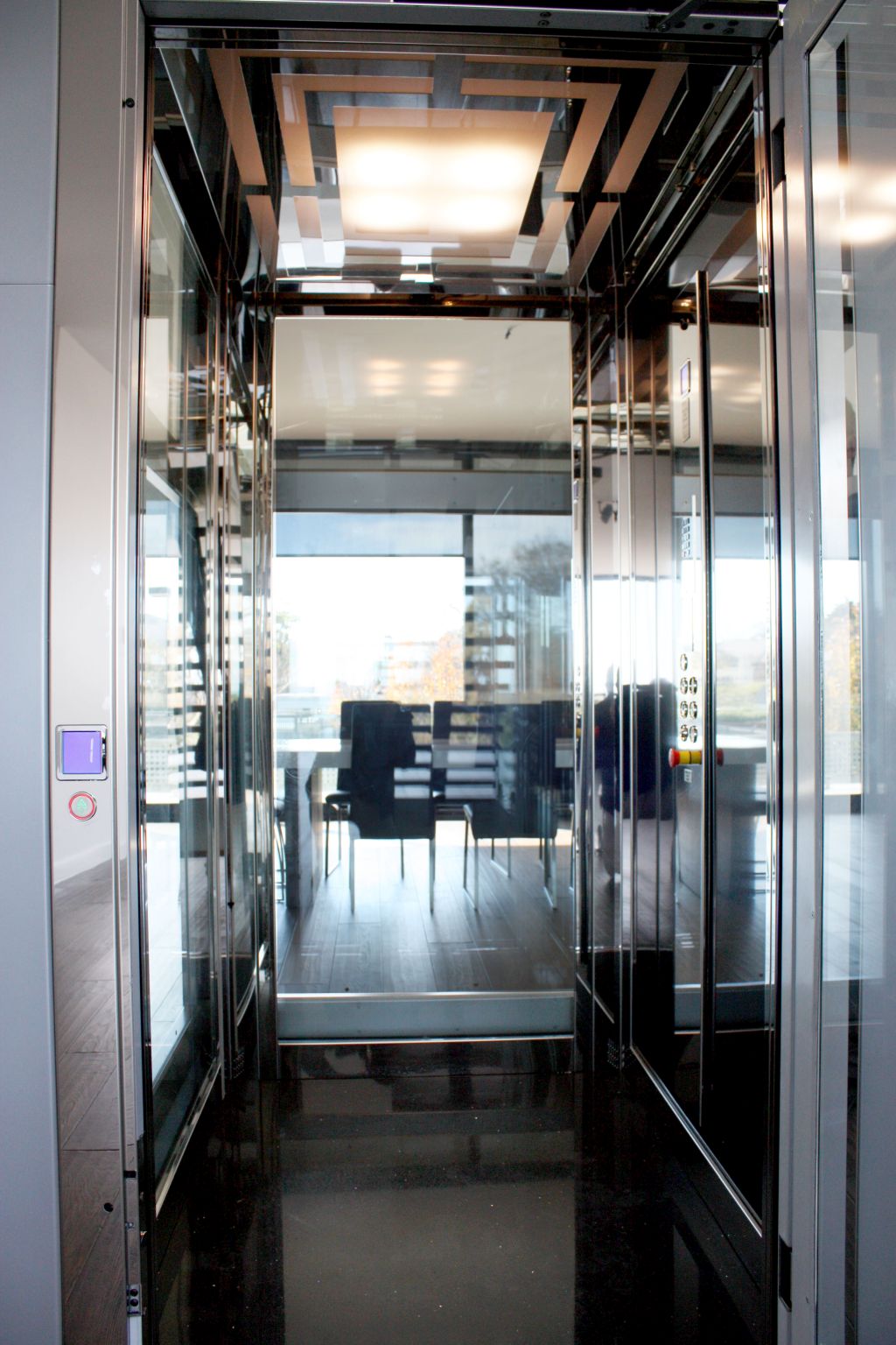 The full glass shaft immediately sets the lift apart, creating a feeling of openness and light. This transparency was further enhanced inside the cabin, where two of the walls are crafted entirely from glass, visually extending the shaft and bathing the lift interior in natural light. This thoughtful design reduces any sense of enclosure and heightens the connection to the surrounding spaces.
