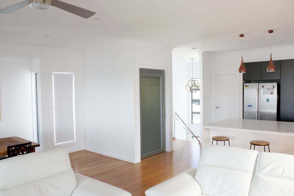 In Brisbane’s leafy suburb of Ormiston, a newly built modern residence has innovatively integrated a home lift directly into its core living space—and the result is both functional and striking. This is more than just a lift; it’s a carefully designed architectural feature that enhances the daily rhythm of the home. The lift opens right into the main living area, elevating everyday access while blending flawlessly with the interior’s white-dominated theme, proving that utility and style can coexist beautifully.