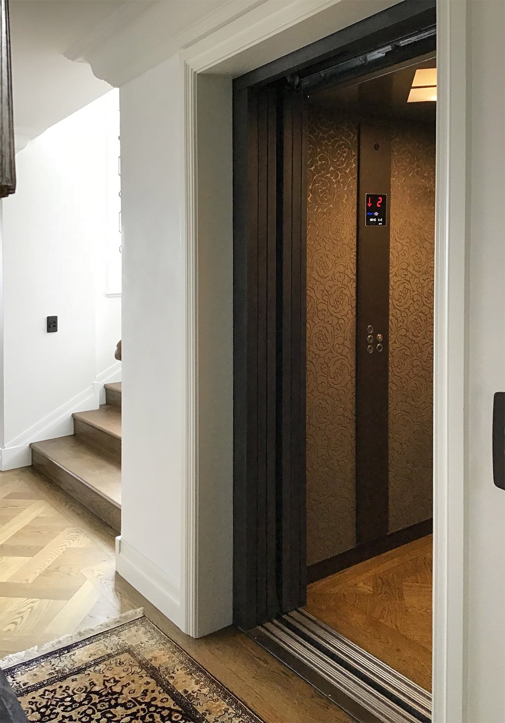 One of the primary challenges was integrating a lift into a home with refined interior materials and distinctive features, without compromising the spatial flow or aesthetic harmony. The solution was a tailored E2 lift installation featuring:
