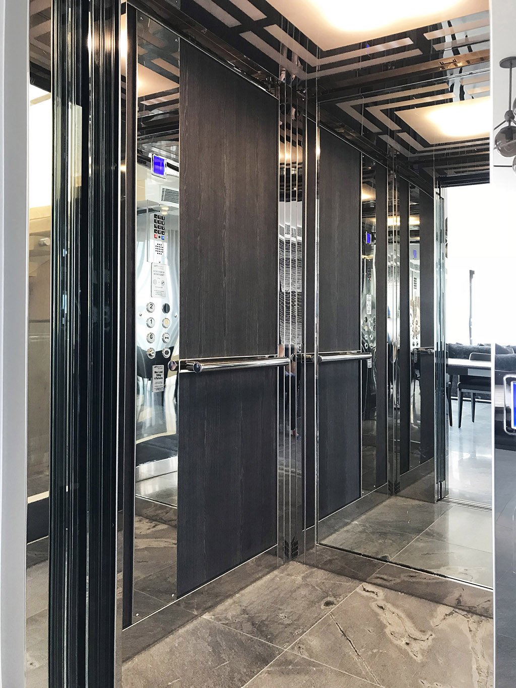 The customised finishes and materials selected for this E2 elevator are a testament to Lift Shop’s commitment to tailoring residential lifts to each client’s unique style and needs. The combination of powder-coated doors with clear glass, decorative wall panels, and full-height mirrors creates an environment that is both functional and aesthetically striking.