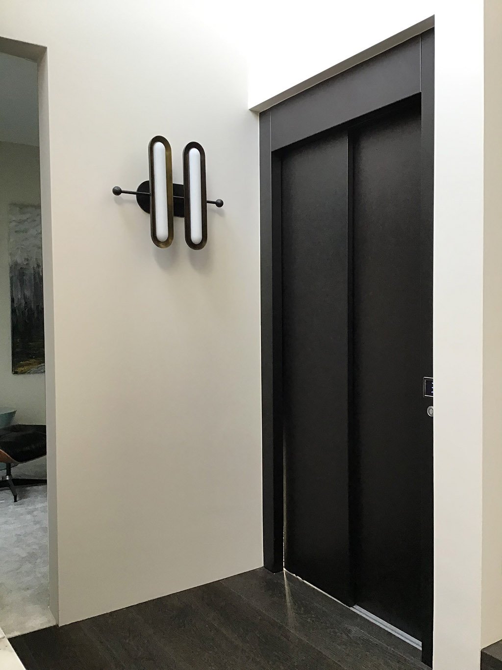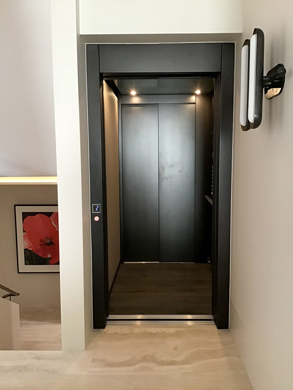 The opposite entry configuration streamlined movement, perfect for a home designed for entertaining. These features made the lift a stylish, functional centrepiece. Explore similar designs in our E Series compact home lift options.