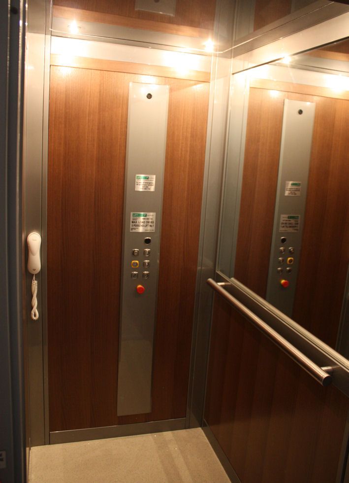 Inside, the cabin walls are clad in warm timber veneer, adding texture and natural contrast to the lift’s clean steel finishes. The flooring is finished in classic stone — a grounded and durable surface that brings a sense of understated luxury to the interior. A half-mirror handrail completes the design, offering both utility and depth to the cabin space.