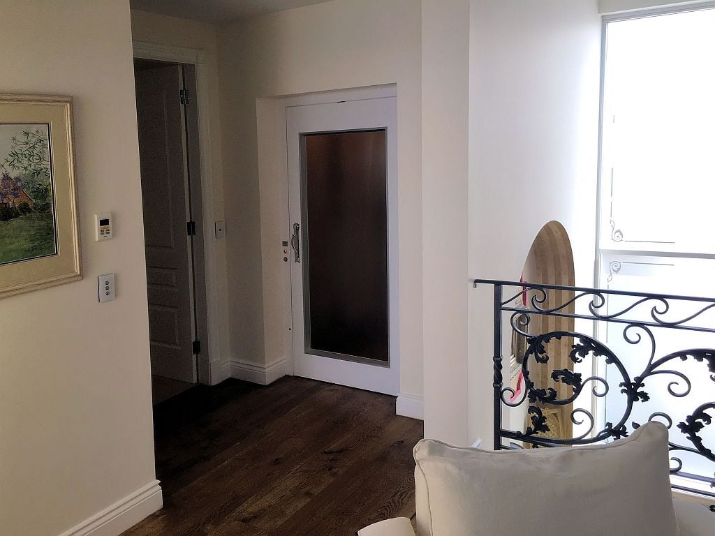 Externally, the lift is framed with white powdercoated steel doors and frosted panoramic glass panels, ensuring privacy without sacrificing light or openness. Custom polished stainless steel door handles were selected to complete the design, perfectly tying in with the rest of the home’s premium fixtures and finishes.