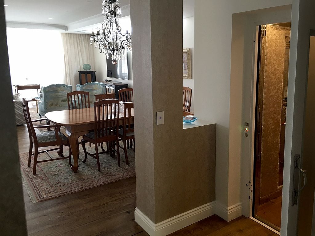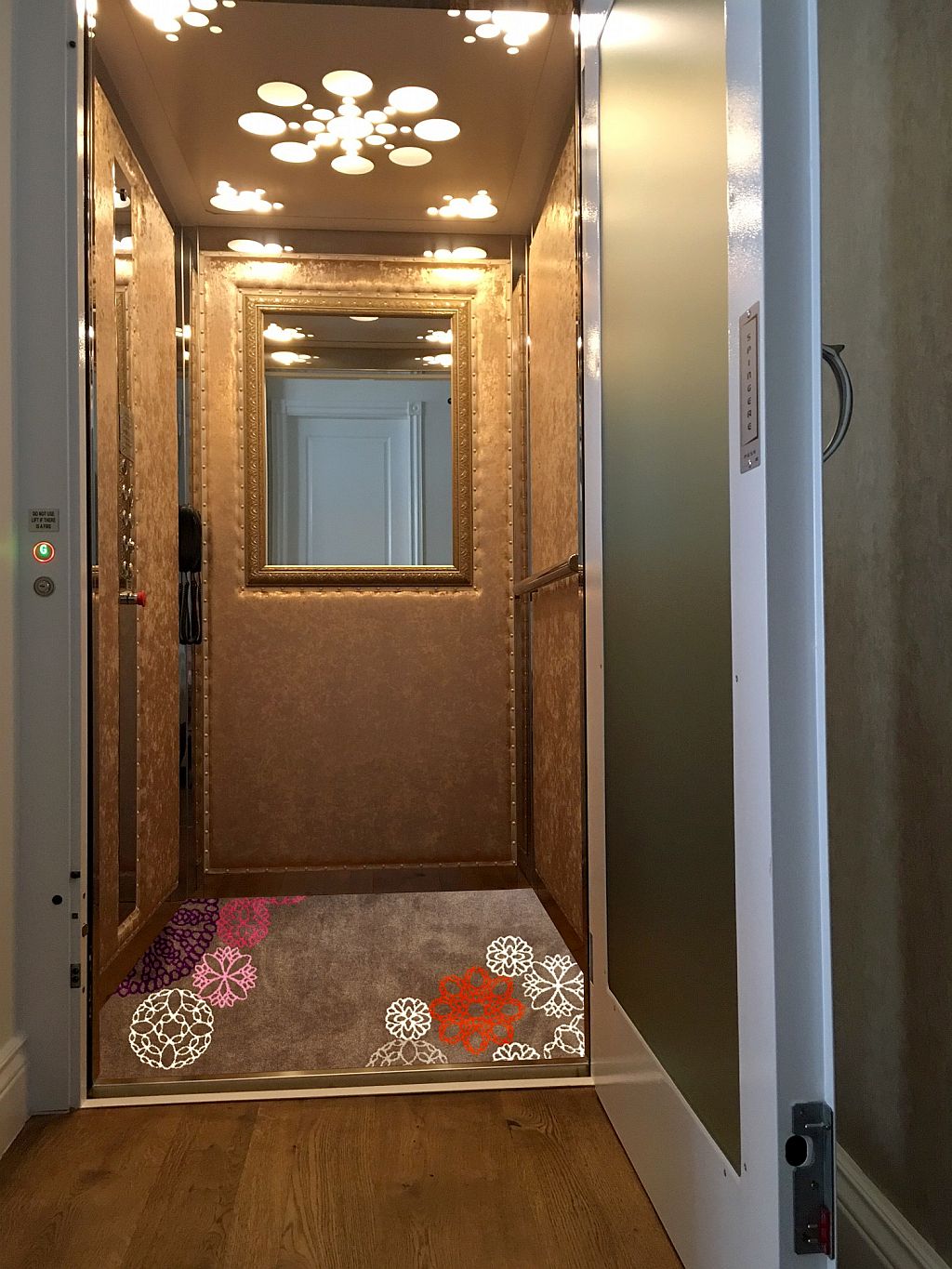 Installed with a single opening configuration, the lift was designed to serve all four floors — from the rooftop garden to the gymnasium and everything in between. The cabin itself is a standout, fitted with plush cushioned velvet walls, offering a tactile, luxurious interior feel that is rarely seen in residential lifts. A framed inlaid mirror on one wall adds depth and a hint of old-world glamour, balanced by polished stainless steel profiles that maintain a clean, modern edge.