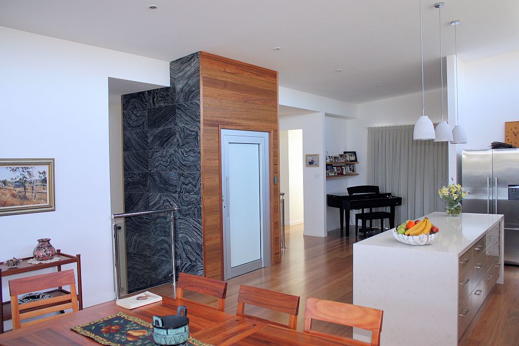 For this new build on the Sunshine Coast, the client wanted to future proof it so it was access was easy in the later years – in order to guarantee this, our E1 elevator was designed in. The lift was installed into a shaft by the builder, which was fitted with black marble coupled with the warmth of timber cladding at each landing making a design statement of its own!