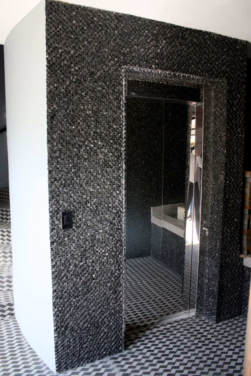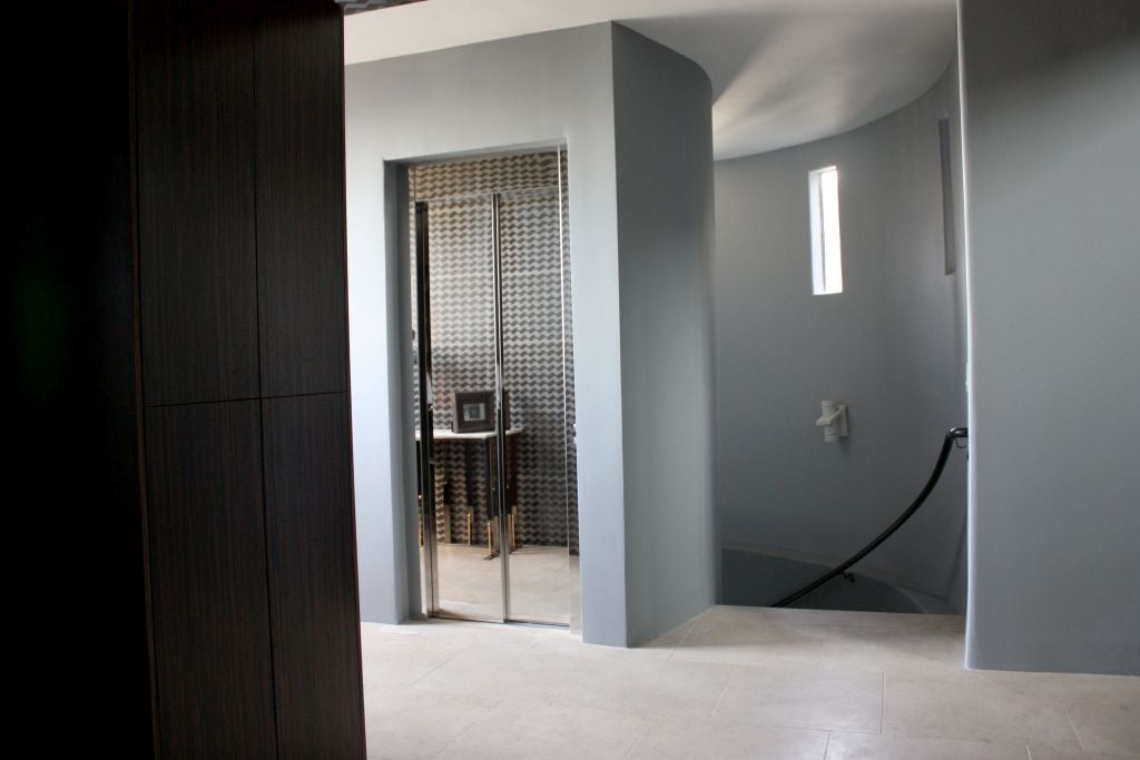 The original circular shaft—rare and character‑laden—became the canvas for our size‑to‑suit E2 lift, configured flawlessly to match the curved envelope. The result is a seamless marriage of form and function: polished stainless steel swing doors open into a cabin with three mirrored walls, heightening both light and space perception. The full-height mirrors create a jewel‑box effect that reflects the geometric stone flooring and textured wall finishes surrounding the shaft.