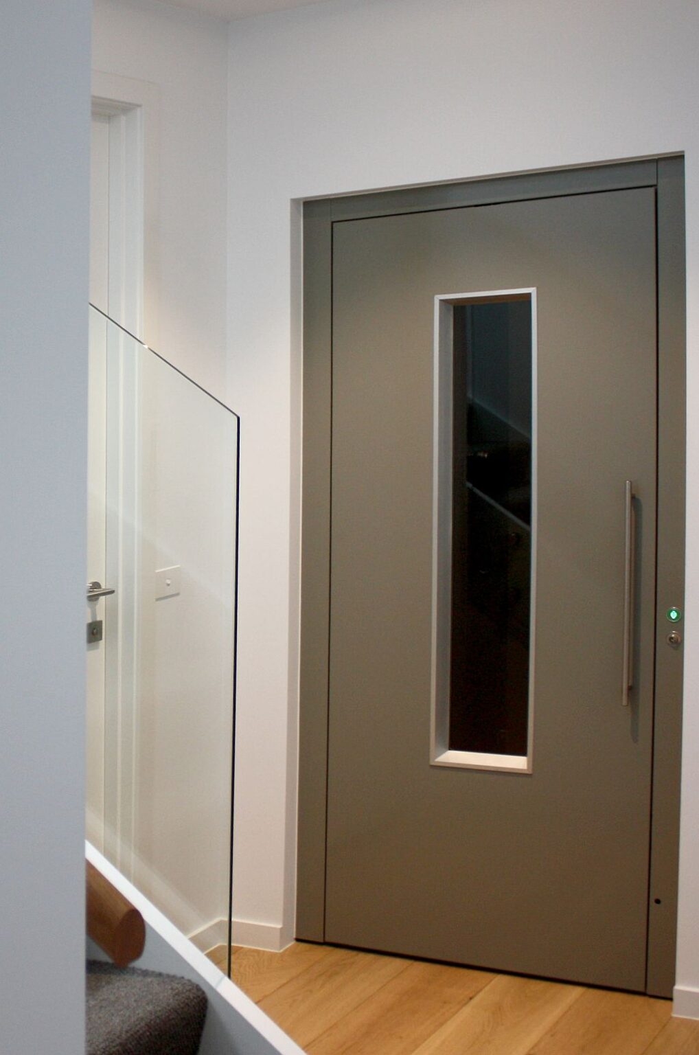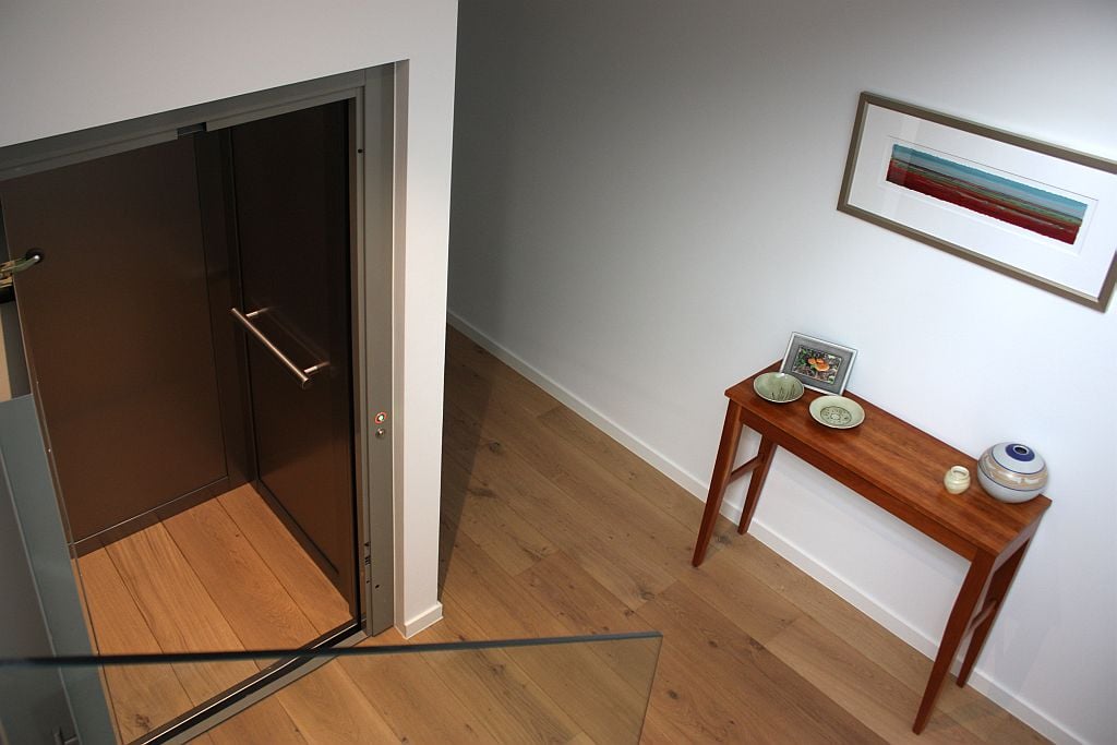 Externally, powdercoated steel doors with large vision glass panels ensured that the lift brought light and visibility to each level, echoing the open and connected design language of the home. These clear glass inserts also made the lift feel less enclosed and more integrated into the overall living experience.