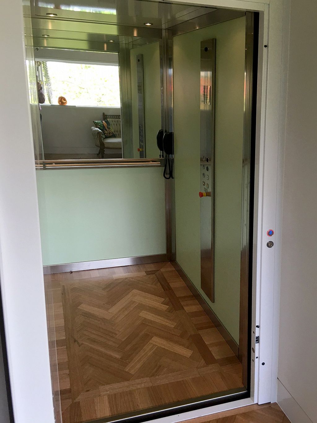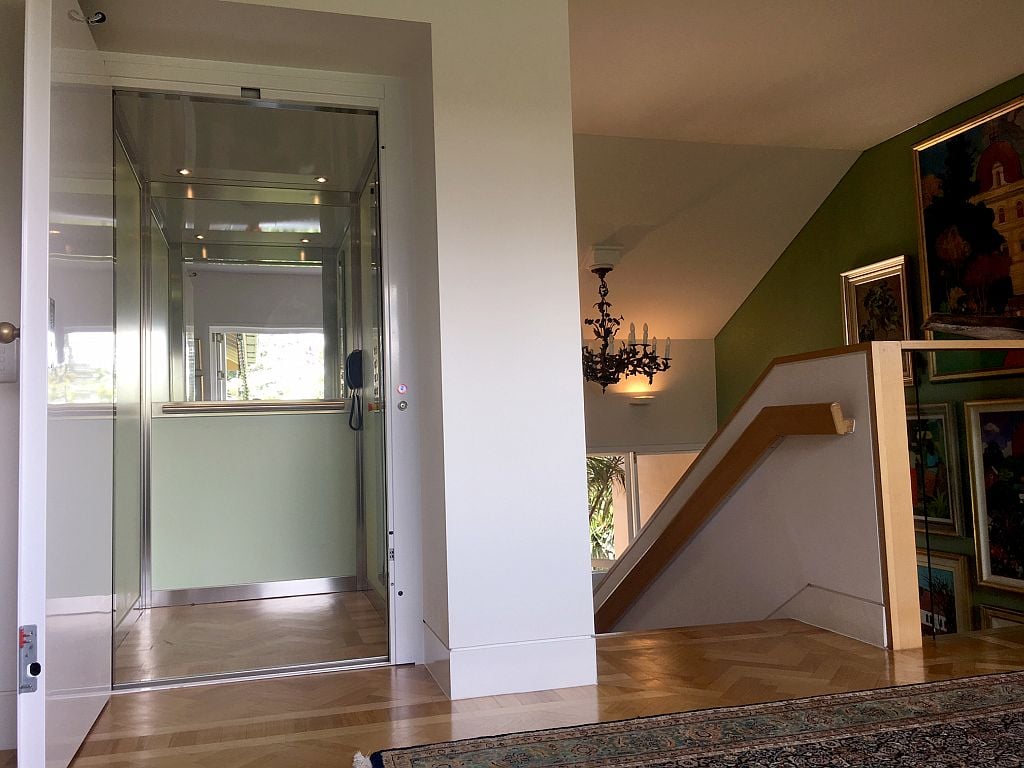 The owners were particularly focused on making sure the lift would not disrupt the home’s established aesthetic. To that end, the interior cabin walls were finished in Arpa 517 Light Green laminate — a soft, refined hue that complements the home’s palette without drawing attention. Brushed stainless steel profiles added a crisp modern edge, while a half-height mirror expanded the sense of space inside the cabin.