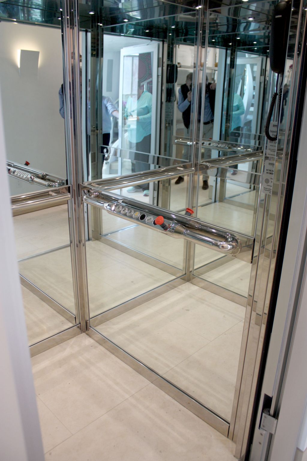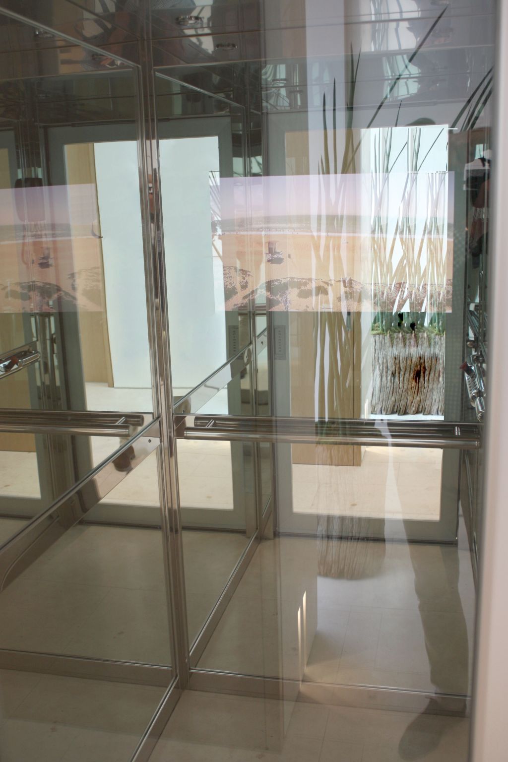 Inside the lift cabin, every surface reflects light and atmosphere. All three walls are clad in full‑size mirrors that visually expand the space, while polished stainless steel trims frame reflections with a clean, architectural edge. The effect is cinematic—people inside the lift can see the beach and horizon, mirrored infinitely, creating a sense of floating between sand and sky.