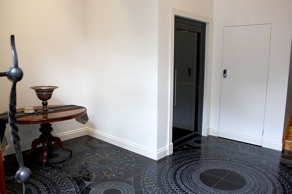 But the true design standout was the floor: laid in hand-cut Italian tiles, it echoed the intricate pattern found in the adjacent foyer landing, creating a sense of flow and artisanal detail. This was more than a lift — it was a design statement, executed with the same care as the rest of the home.