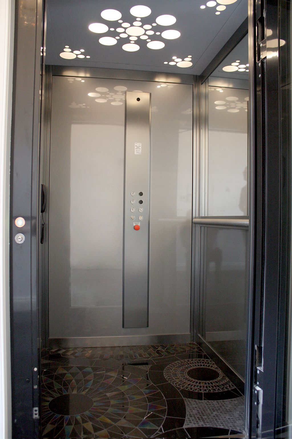 Inside the cabin, the walls were finished in Similinox skinplate — a refined metallic texture that paired perfectly with the brushed stainless steel handrail and subtle half-height mirror. A crisp white ceiling with integrated LED downlights created a clean, bright interior that made the lift feel spacious and welcoming.