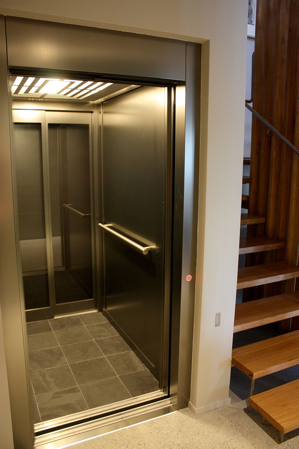 Serving all three levels, the E2 lift was intentionally finished with clean, contemporary materials. Brushed stainless steel and full-size glass panels were used for both the cabin walls and landing doors, delivering transparency, durability, and modern flair.