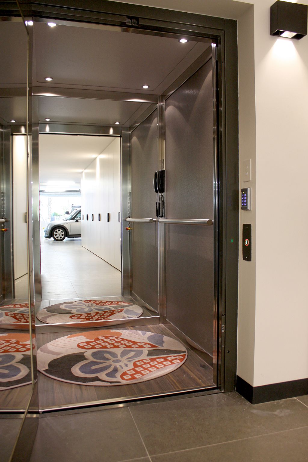Inside the cabin, the lift continues to impress. The walls and ceiling are finished in PPS1 Grigio skinplate, delivering a muted, high-end aesthetic that complements the brushed stainless steel profiles and half-height mirror feature. For added visual harmony, the flooring was supplied and installed by the homeowner, tying the lift seamlessly into the surrounding interior design.