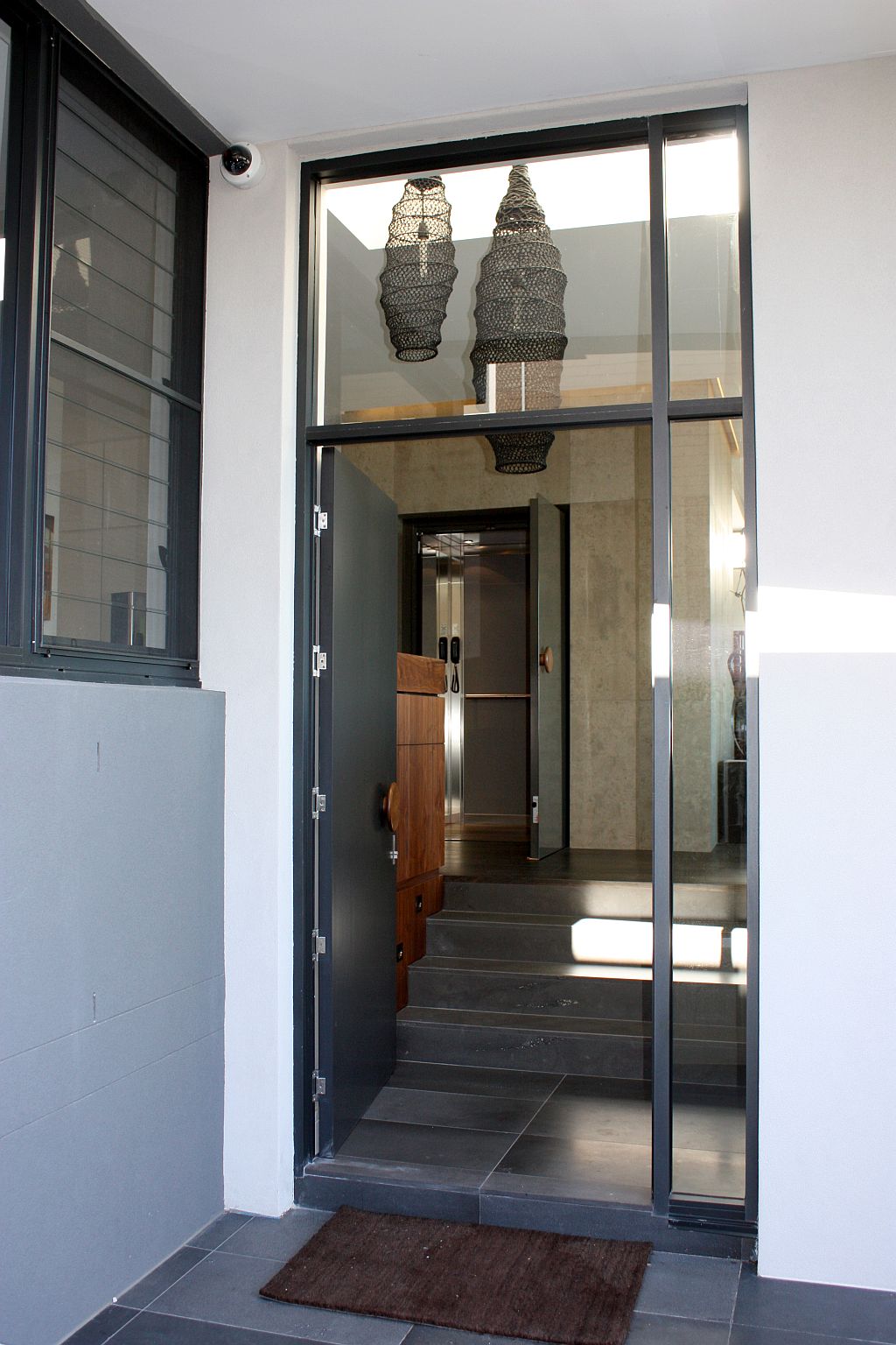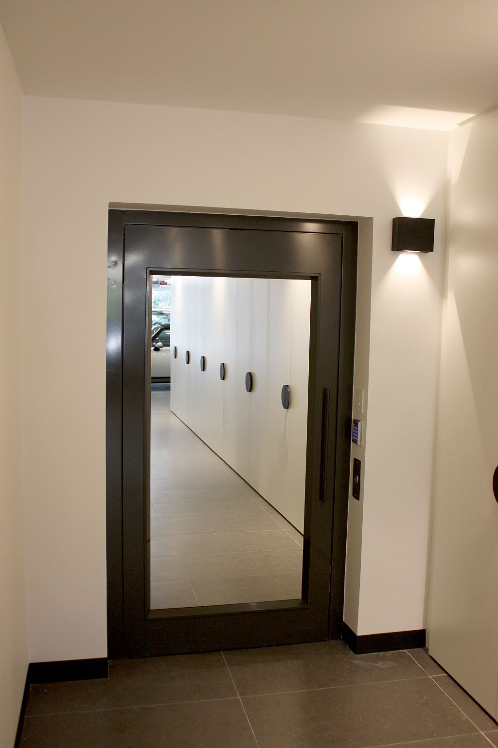 The ElfoLift installed here features a generously sized 1200mm wide x 1300mm deep adjacent through car configuration, offering plenty of space and versatility. The landing doors vary by level — some are finished in powdercoated RAL 7022 (with and without glass panels), while others have been primed and painted locally to blend in with the home’s individual design scheme. Each floor also features different handle styles, showing how even subtle details were carefully considered.