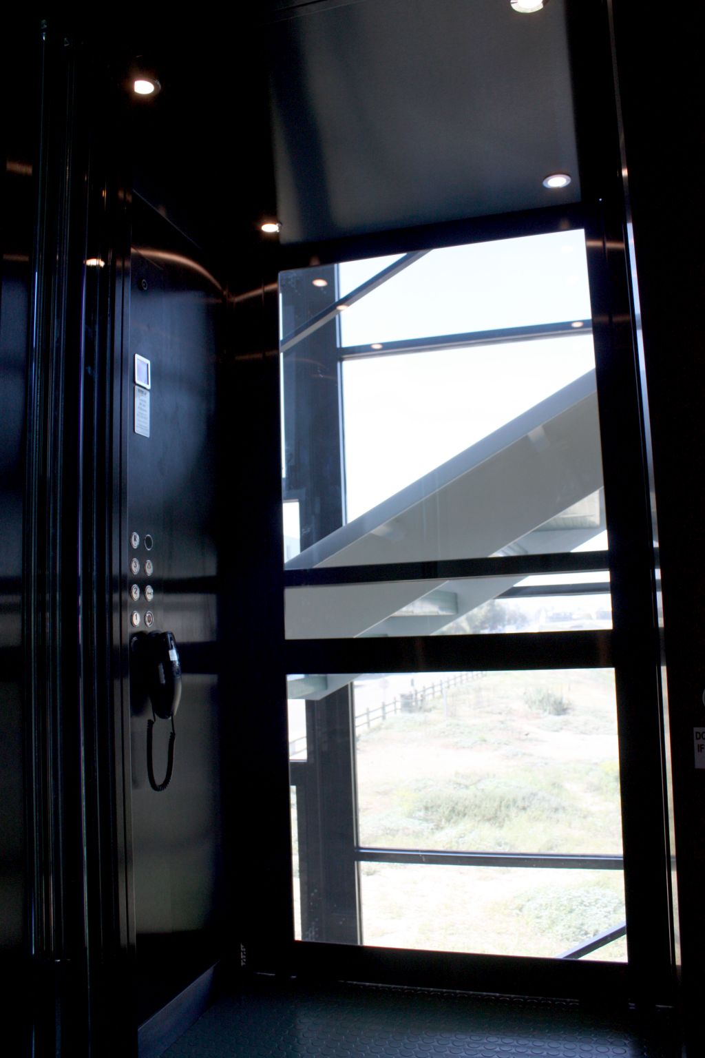 With the home featuring wraparound staircases, expansive corridors, and an architectural emphasis on natural light, the lift needed to contribute to the sense of openness rather than disrupt it. The solution? An E Series lift in an adjacent through car layout, complete with polished black stainless steel finishes and full clear glass panels. This choice not only elevated the property’s style but ensured seamless transparency and visibility between rooms, floors, and even exterior areas.