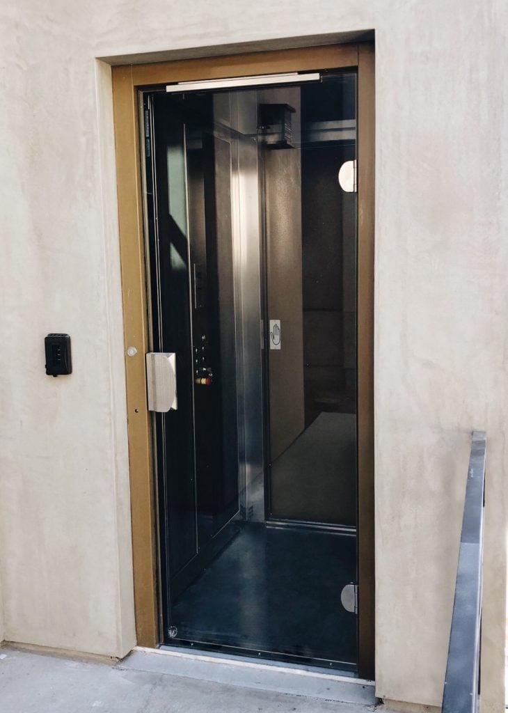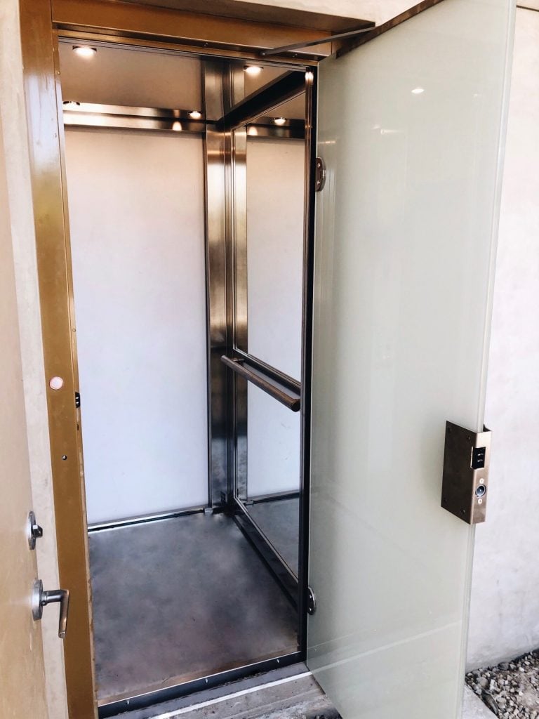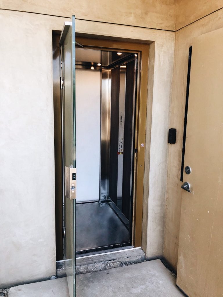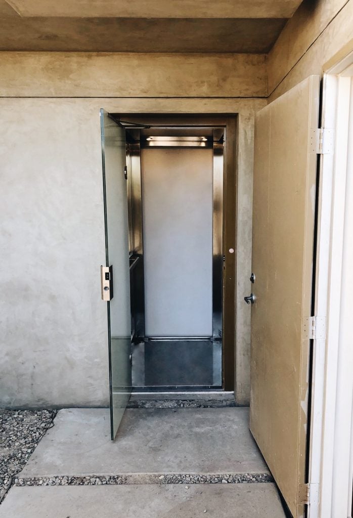 This unique home required an elevator that offered equivalent functionality that matched its rough exterior. The E1 Villa Door with brushed stainless steel finishes and ARPA Laminate provides this client with both structural minimalistic style and easy access to all levels of the home.