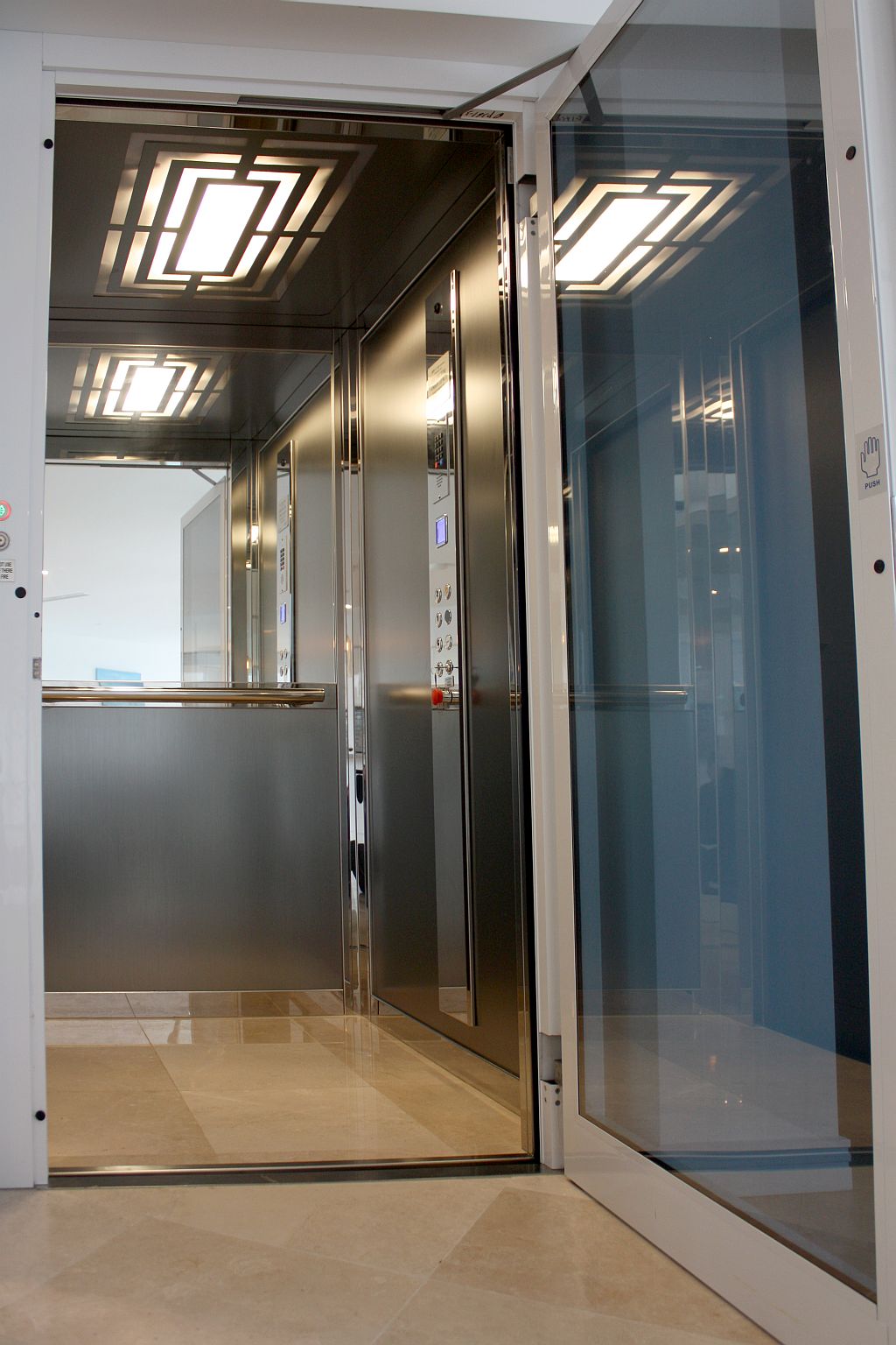 Designed for convenience and sophistication, the lift features anodised aluminium doors with full-height mirror glass panels that reflect both light and space throughout the shaft. Inside the cabin, two walls are finished in F41PPS brushed stainless steel skinplate — a durable yet elegant material that enhances the interior’s crisp, modern feel. A half-height mirror expands the cabin’s sense of space while complementing the polished stainless steel corner profiles, handrail, and car operating panel — complete with integrated position indicator for user ease.