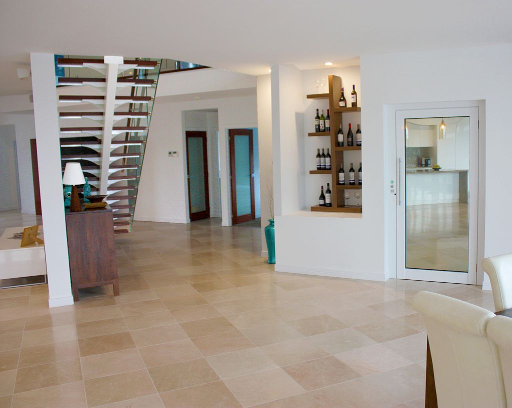 The ceiling, also in matching F41PPS, features a subtle pattern that ties in visually with the walls while diffusing ambient lighting for a soft, welcoming interior. To ensure design cohesion, the floor was tiled with custom finishes selected to match the home’s broader palette — a perfect reflection of how our residential lifts are integrated into high-end architectural environments.