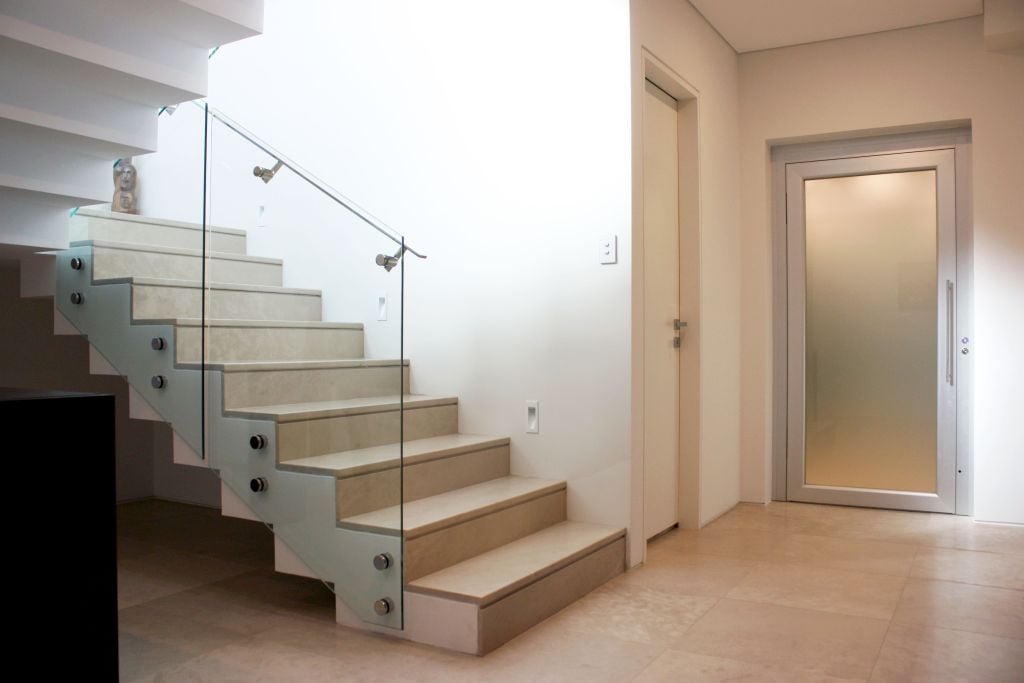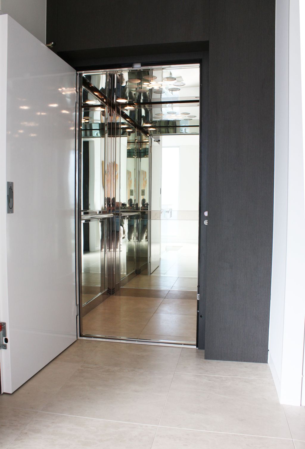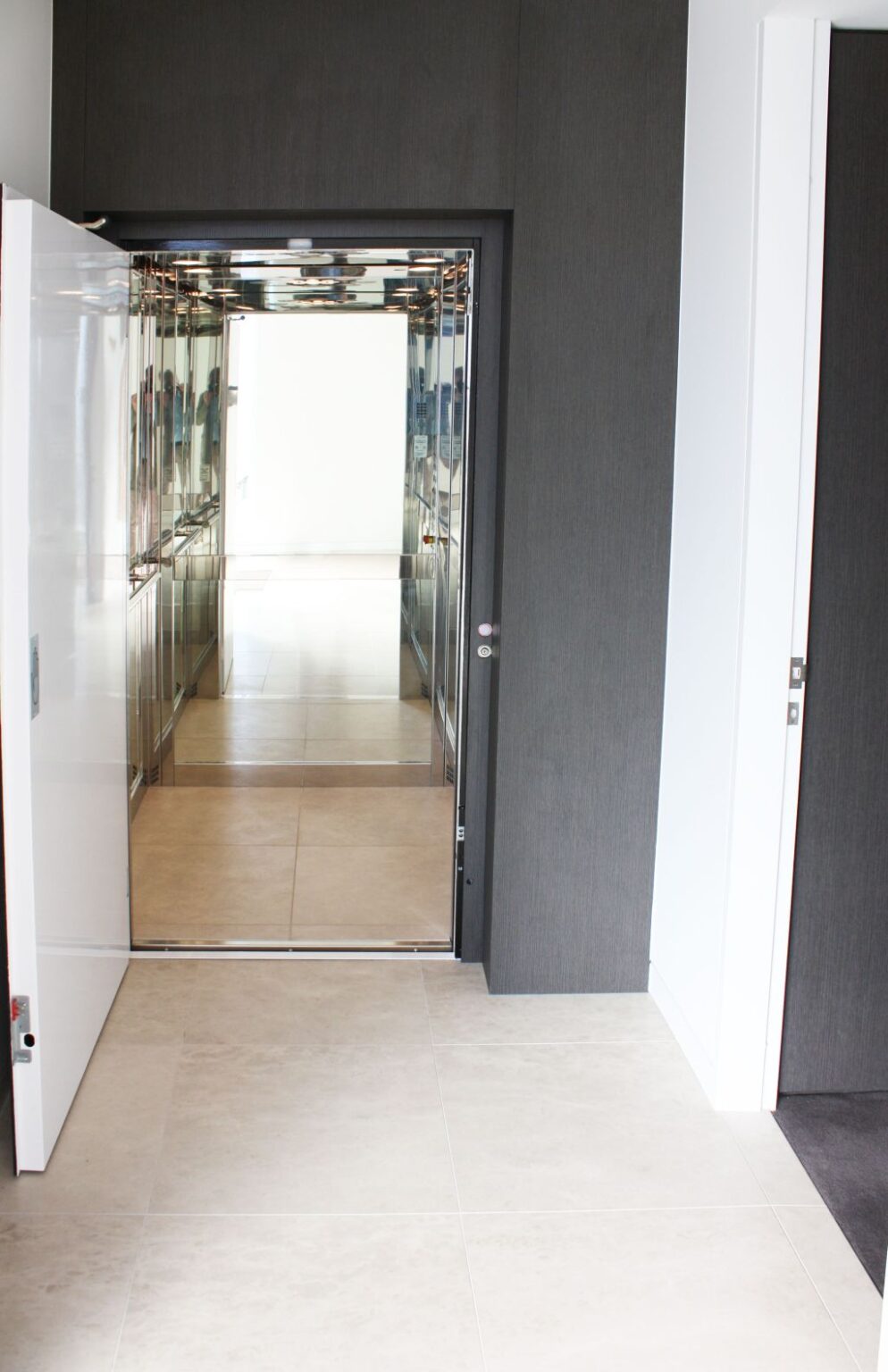 This time, the builder selected our E1 model—a spacious 1200mm x 1200mm cabin that was custom-tailored to suit the home’s modern design and clean lines. The lift’s interior was outfitted with polished stainless steel profiles that reflect both light and luxury, while mirrored walls create a sense of expanded space. To complete the sophisticated look, a bespoke stone floor was installed, adding tactile elegance beneath the feet. Every detail was considered for maximum comfort and aesthetic integration.