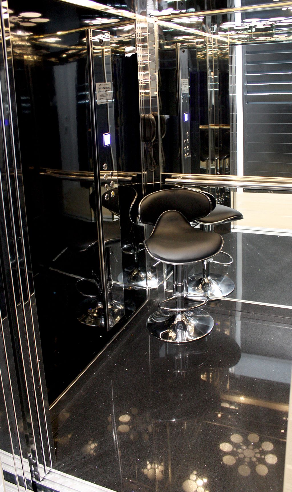 Inside the 1100mm wide x 1400mm deep cabin, the design leans into drama and sophistication. Polished stainless steel panels on all profiles and trims give a high-luxury sheen, contrasted by jet-black glossy wall finishes and flooring that create depth and intrigue. The result is a sensory-rich environment — elevated, moody, and unapologetically modern.