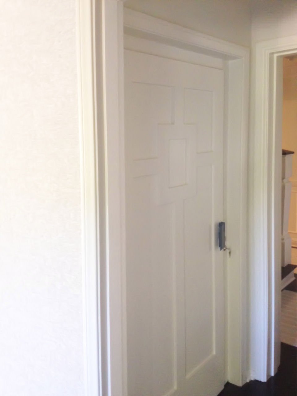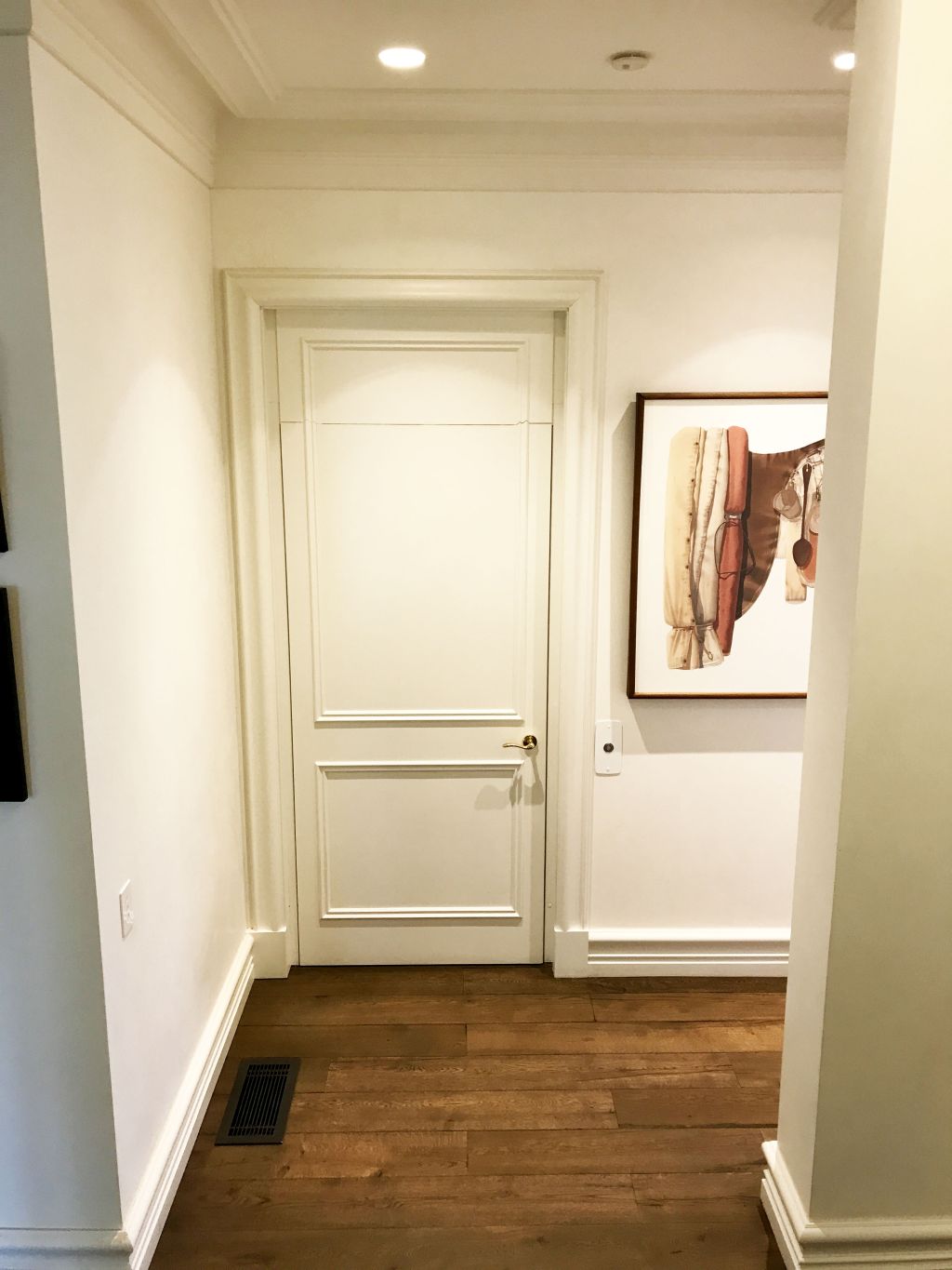 A curated gallery below showcases correct door framing, finished openings, custom button plates, and completed installations for builder reference.
