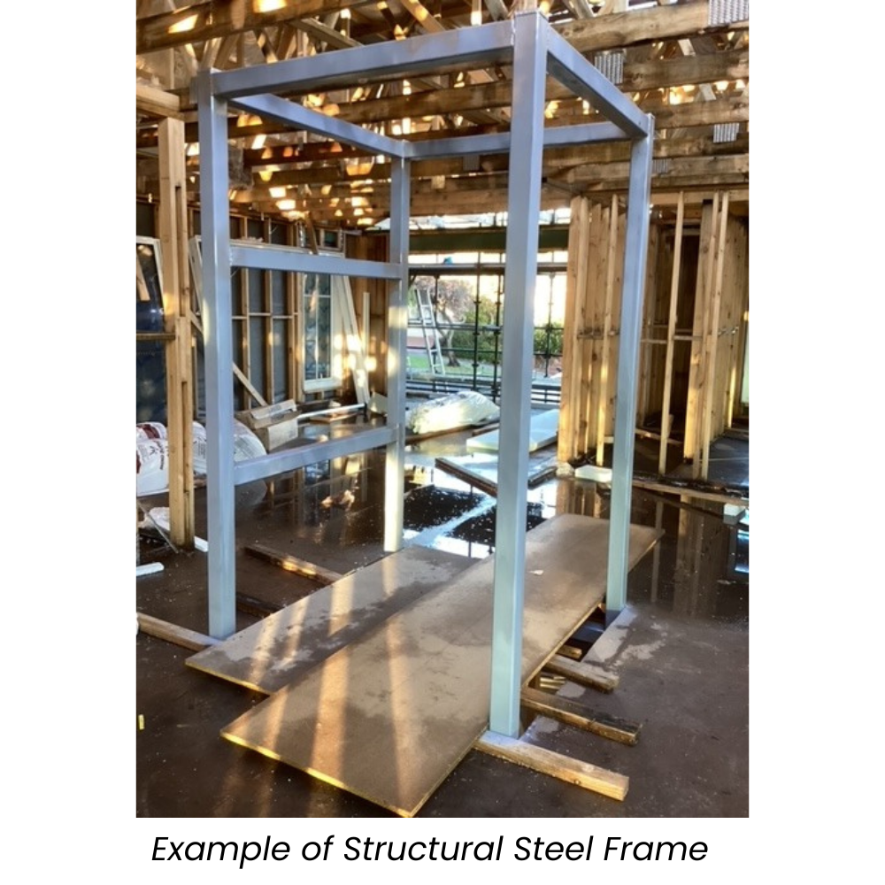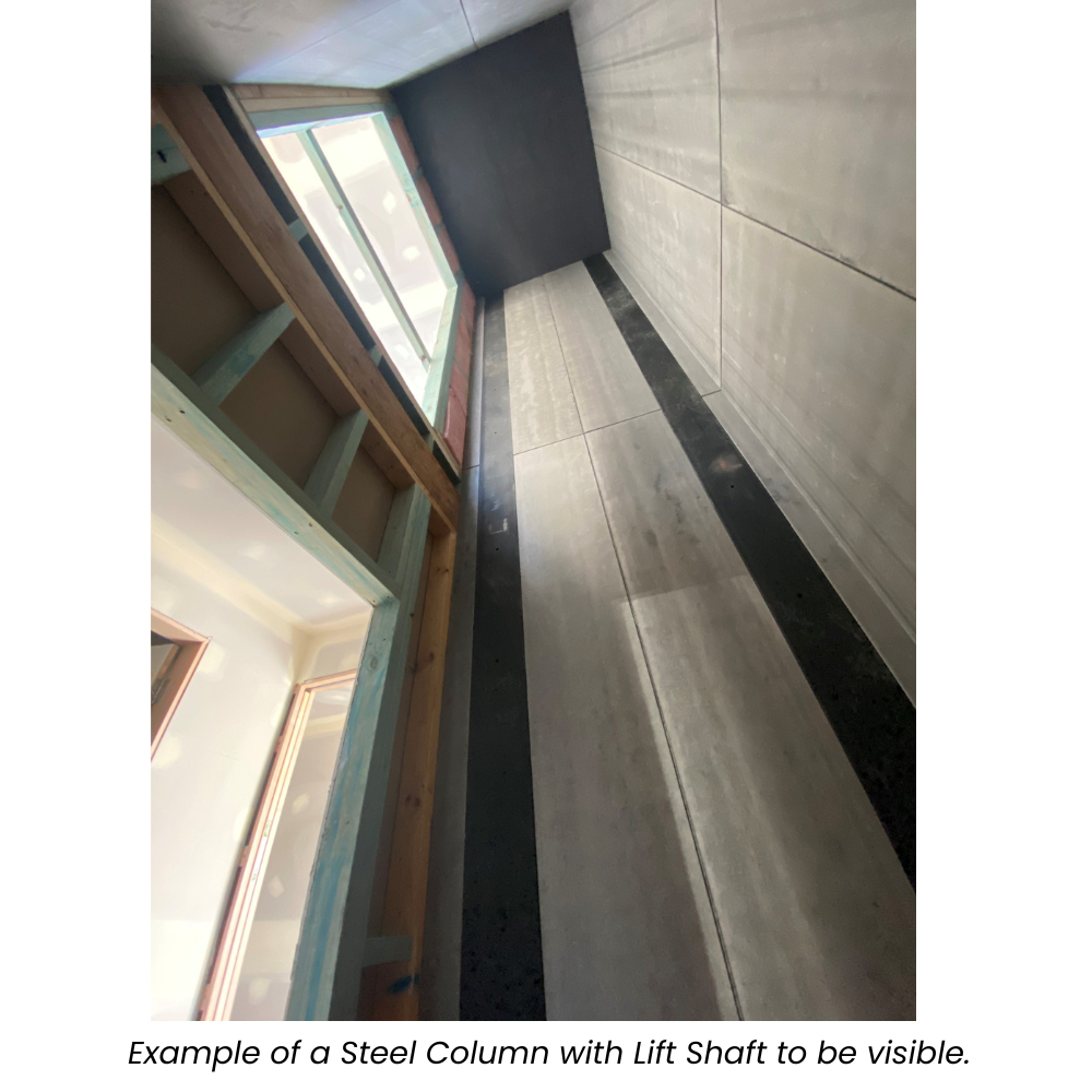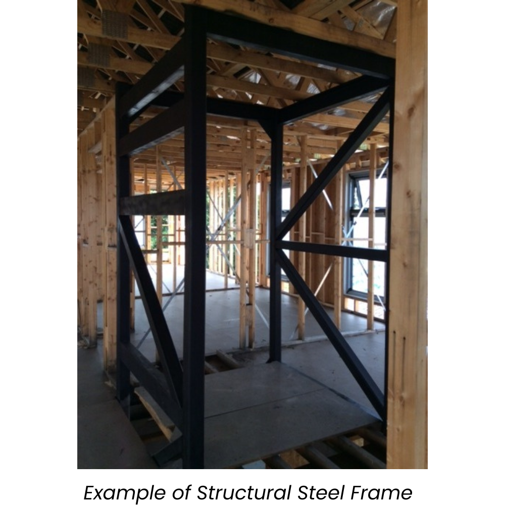 For homes where a traditional load-bearing shaft is impractical, Lift Shop can supply a self-supporting steel shaft structure, the same framework referred to as our “Bones Only Shaft”.