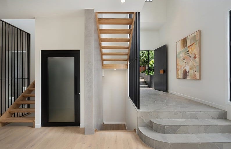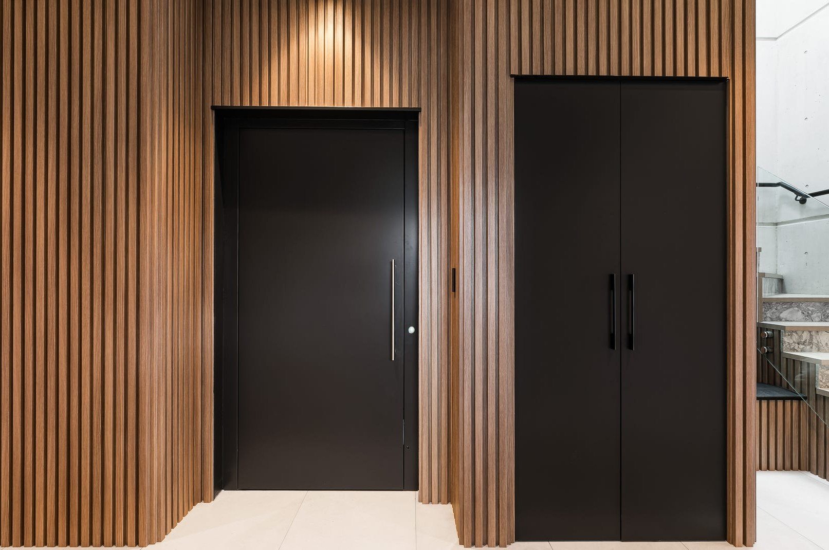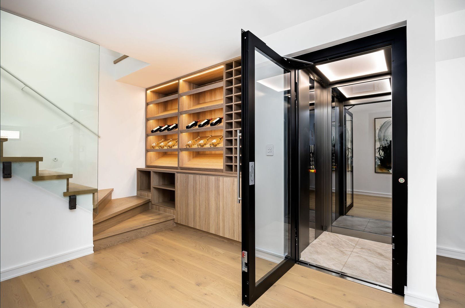 Colour-matching is straightforward: bring samples of your joinery or finishes to our showroom, and our designers can source or apply matching materials. The wall thickness of the lift shaft equals the door thickness (55 millimetres), which our team coordinates with your builder or architect. Explore our portfolio to see examples of clad doors in different finishes and colours.
